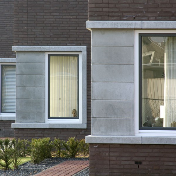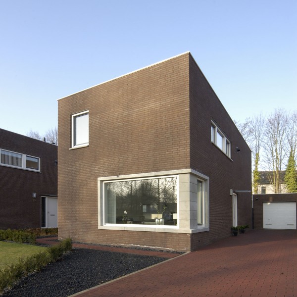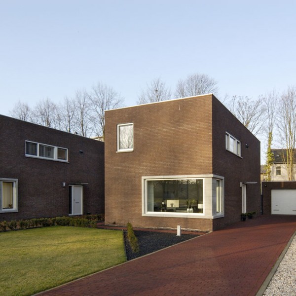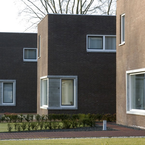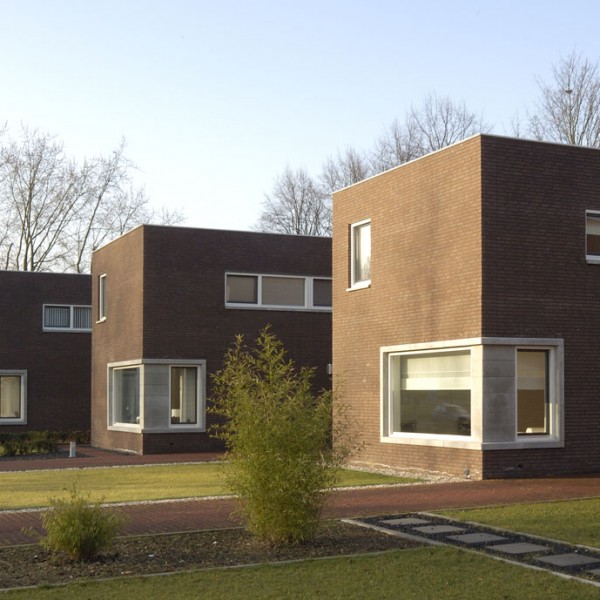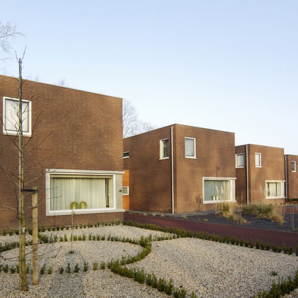 langs een doorgaande weg werden deze 6 woningen gerealiseerd als strakke blokjes – de woningen werden op een zekere afstand van de weg gepositioneerd met strak vormgegeven voorterrein – de keuken schuift uit het hoofdblokje waardoor er vanuit de keuken zowel contact met de tuin als zicht op de voorzijde van de woning is
